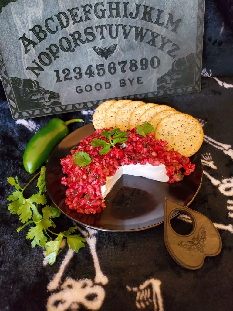 That’s it! Serve chilled on its own, or over a small block of Tofutti (or your preferred plain vegan cream cheese brand). We like to pair it with multigrain crackers or tortilla chips, and it goes beautifully as an addition to any holiday main dish. Have a safe, delicious Winter season! Blessed Yule and Merry Solstice! 🎄✨️